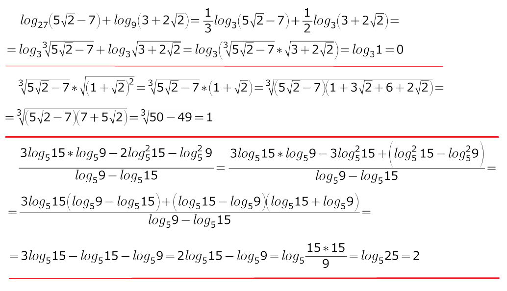 в первом примере, конечно же, не легко догадаться, что под кубическим корнем полный куб, но под квадратным корнем всегда нужно "искать" полный квадрат... а для логарифмов всегда цель ---привести их к одному основанию)))