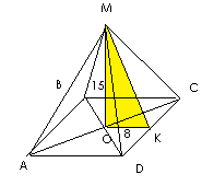 через точку пересечения диогоналей квадрата авсд проведен перпендикуляр мо к его плоскости,равный 15 см. найдите расстояние от точки м до сторон квадрата,если ав=16 см.