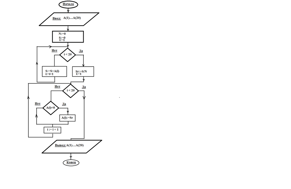 Составить блок-схему и написать программу на языке программирования QBASIK). Дан массив А из 20 элементов. Заменить отрицательные элементы массива на среднее арифметическое элементов массива. Результат вывести на печать.