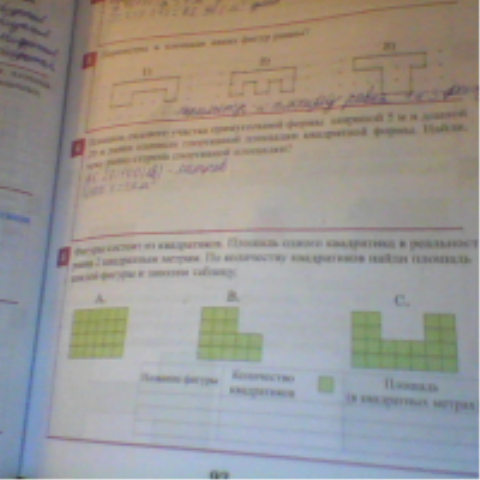Фигуры состоят из квадратиков.Площадь одного квадратика в реальности равна 2 квадратным метрам.По количеству квадратиков найди площадь каждой фигуры и заполни таблицу.