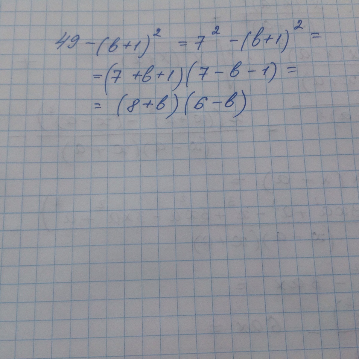 49 - (b + 1)^2 = 7^2 -(b + 1)^2 = ((7- (b + 1))(( 7 + (b +1)) = (7 - b -1)(7 +b +1) =