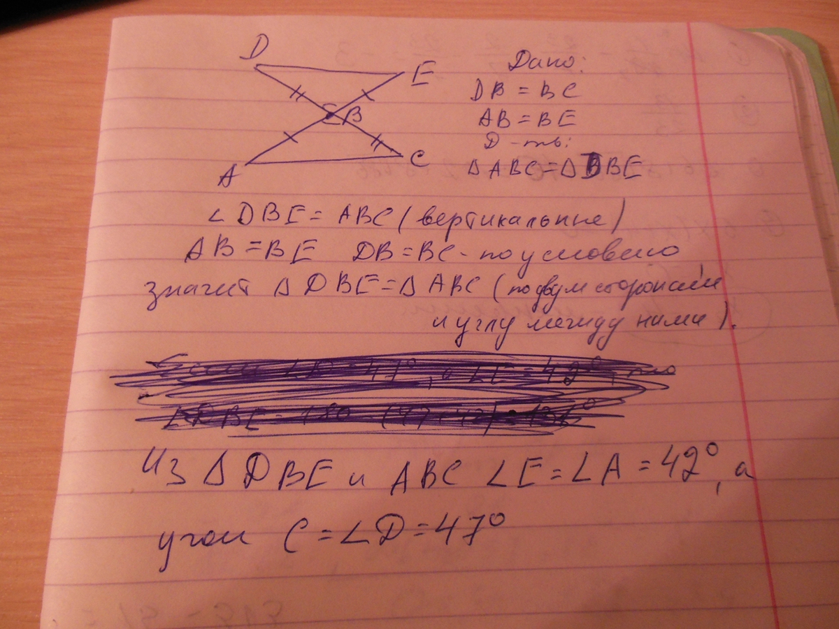 отрезки АЕ и ДС пересекаются в точке В,являющейся серединой каждого из них.1) Докажите, что треугольникАВС=треугольникуЕВД.2)Найдите угол А и угол с треугольника АВС,если в треугольнике ВДЕ уголД=47 градусов,уголЕ=42 градуса