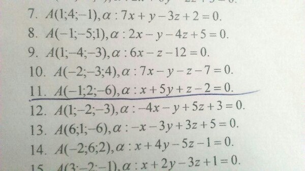 Напишите каноническое уравнение прямой, проходящей через точку А и перпендикулярной плоскости a под номером 11