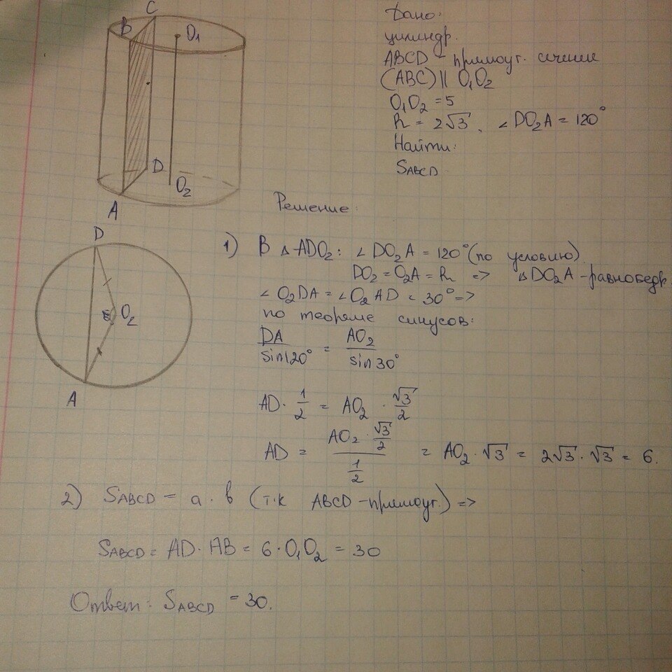 Плоскость, параллельная оси цилиндра, отсекает от окружности основания дугу в 120°. Высота цилиндра 5 см, радиус основания 2корень3 см . Найти площадь сечения.