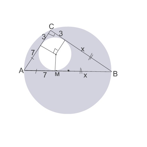 Сделать очень подробно задачу есть рисунок.найти R-?,окр.описанной около прямоугольного треугольника , если радиус вписанной окр.в этот прямоугольник r =3см,один из катетов = 10см)R=1/2гипотенузы
