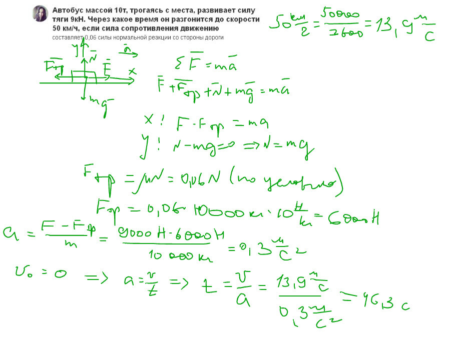 Автобус массой 10т, трогаясь с места, развивает силу тяги 9кН. Через какое время он разгонится до скорости 50 км/ч, если сила сопротивления движению составляет 0,06 силы нормальной реакции со стороны дороги