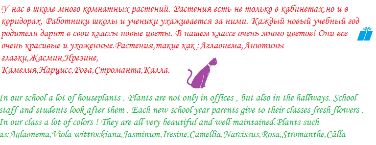 Помогите! Зарание спасибо! Сочинение на тему комнатные растения в школе. На английском языке с переводом на русский если можно!?