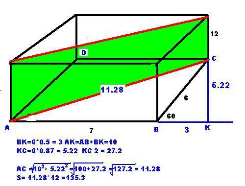 Стороны основания прямого параллепипеда равны 7 дм и 6 дм, а угол между ними 60 градусов. Найдите площадь большего диагонального сечения параллепипеда, если его высота равна 12 дм