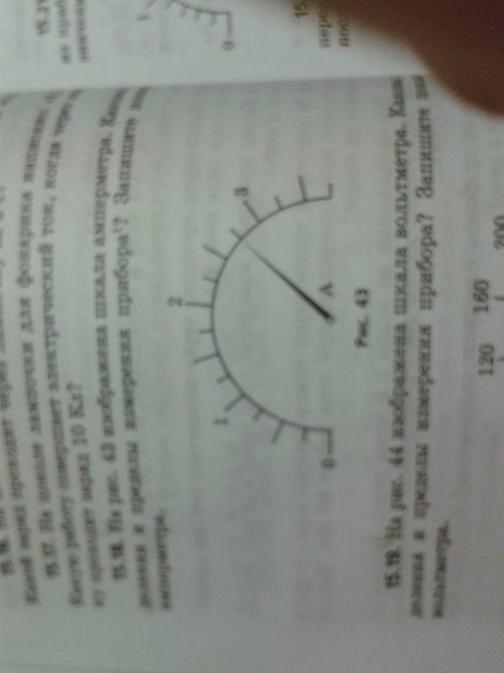 На рис.43 изображена шкала амперметра. Каковы цена деления и пределы измерения прибора? Запишите показания амперметра.