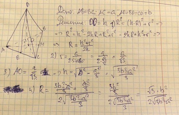 Cторона основания правильной треугольной пирамиды равна а, боковое ребро b. Найти радиус описанного около пирамиды шара. Желательно 3 способа решения
