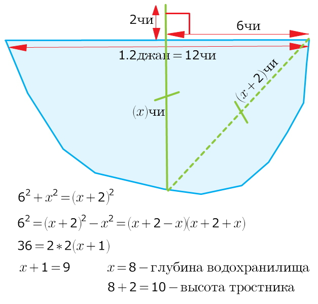 «Ширина водохранилища равна 1,2 джан (1 джан = 10 чи). В его центре растёт тростник, высота которого выше уровня воды составляет 2чи. Этот тростник можно пригнуть таким образом, что его верхушка коснётся берега. Найдите глубину водохранилища и высоту камыша».