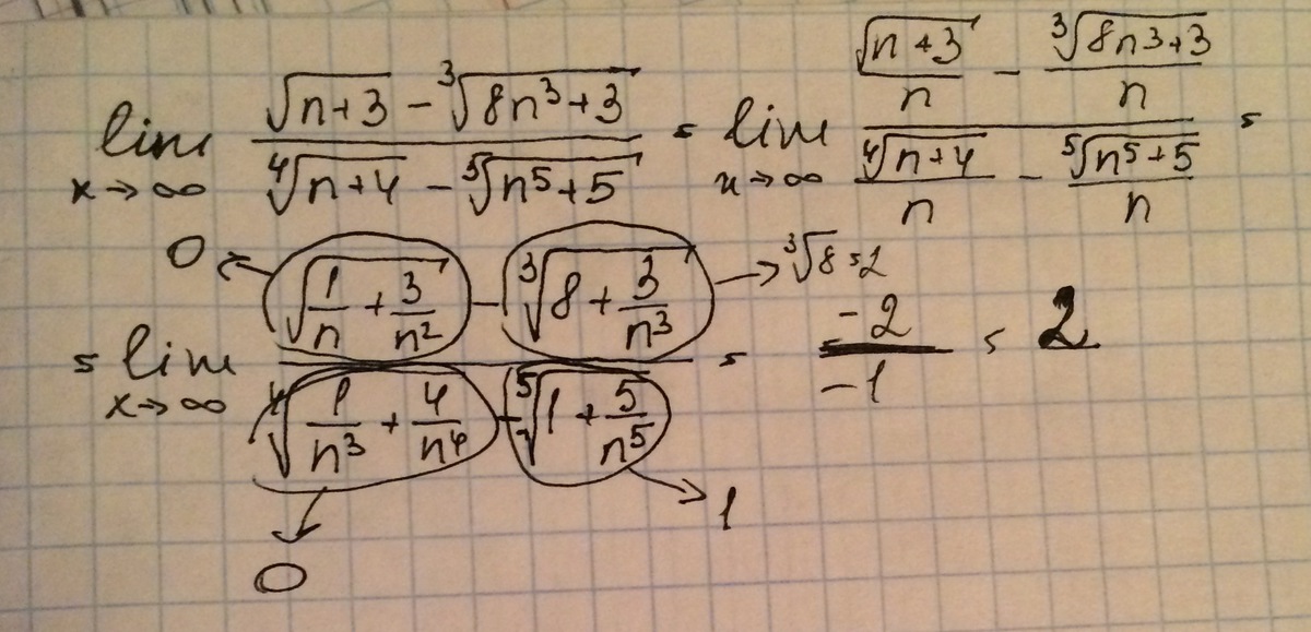 =lim![frac{ sqrt{1/n+ frac{3}{n^2} }- sqrt[3]{8+ frac{3}{n^3} } }{ sqrt[4]{ frac{1}{n^3} + frac{4}{n^4} }- sqrt[5]{1+ frac{5}{n^5} } }= limfrac{ sqrt{0+0}- sqrt[3]{8+0} }{ sqrt[4]{0+0} - sqrt[5]{1+0} } = frac{0-2}{-1} =2 frac{ sqrt{1/n+ frac{3}{n^2} }- sqrt[3]{8+ frac{3}{n^3} } }{ sqrt[4]{ frac{1}{n^3} + frac{4}{n^4} }- sqrt[5]{1+ frac{5}{n^5} } }= limfrac{ sqrt{0+0}- sqrt[3]{8+0} }{ sqrt[4]{0+0} - sqrt[5]{1+0} } = frac{0-2}{-1} =2](https://tex.z-dn.net/?f=+frac%7B+sqrt%7B1%2Fn%2B+frac%7B3%7D%7Bn%5E2%7D+%7D-+sqrt%5B3%5D%7B8%2B++frac%7B3%7D%7Bn%5E3%7D++%7D++%7D%7B+sqrt%5B4%5D%7B+frac%7B1%7D%7Bn%5E3%7D+%2B+frac%7B4%7D%7Bn%5E4%7D+%7D-+sqrt%5B5%5D%7B1%2B+frac%7B5%7D%7Bn%5E5%7D+%7D++%7D%3D+limfrac%7B+sqrt%7B0%2B0%7D-+sqrt%5B3%5D%7B8%2B0%7D++%7D%7B+sqrt%5B4%5D%7B0%2B0%7D+-+sqrt%5B5%5D%7B1%2B0%7D+%7D+%3D+frac%7B0-2%7D%7B-1%7D+%3D2++)