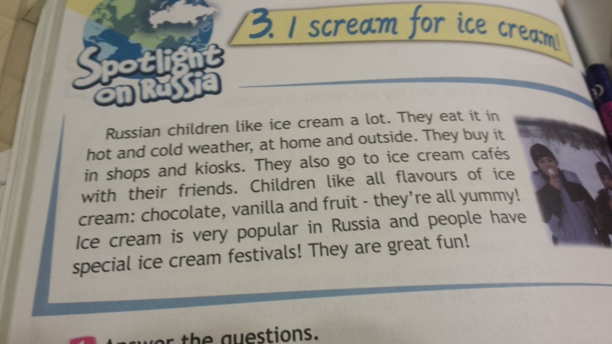 Русские дети очень любят мороженое. Они едят его в жаркую и холодную погоду, дома и на улице. Они покупают его в магазинах и киосках. Они так же ходят в кафе мороженое со своими друзьями. Дети любят все виды мороженого: шоколадное, ванильное и фруктовое - они все очень вкусные. Мороженое очень популярно в России и люди проводят специальные фестивали , посвященные мороженому! Они очень веселые!