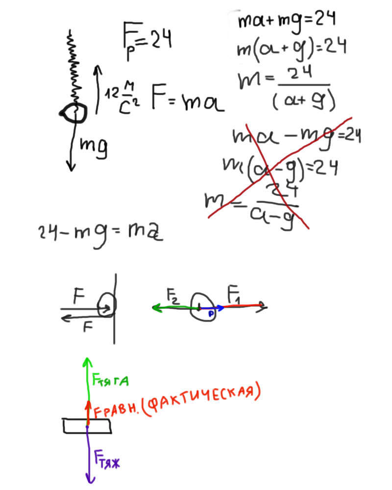 m x a(уск.) + m x g(уск. пад.) = 24Н (сила реакции каната)