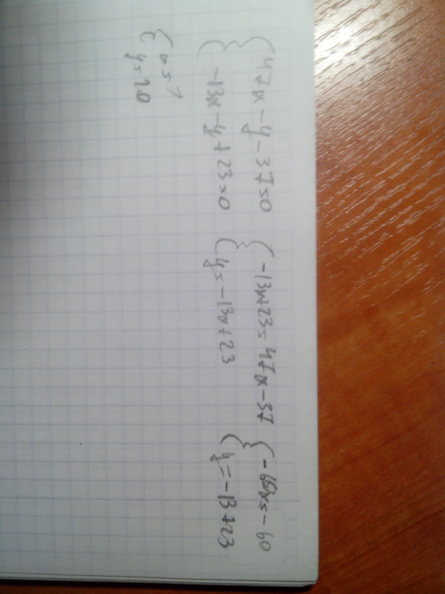 Сейчас напишу получше. 1) делаем систему уравнений: внизу оставляем исходное: y=-13x+23, вверху подставляем вместо y нижнее: -13x+23=47x-37. 2) решаем систему, приводя подобные слагаемые: -60x=60 в верхнем и y=-13x+23. 3) находим значение x: x=1 в верхнем уравнении, затем подставляем в нижнее и находим значение y=-13*1+23. 4) Записываем в ответ точки пересечения (1;10)