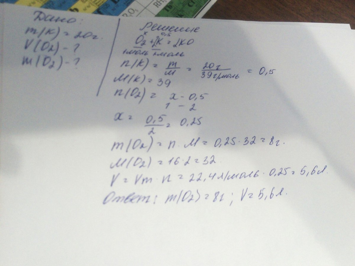 Найти массу и объём кислорода которые требуются для взаимодействия калия массой 20 грам. По уравнению