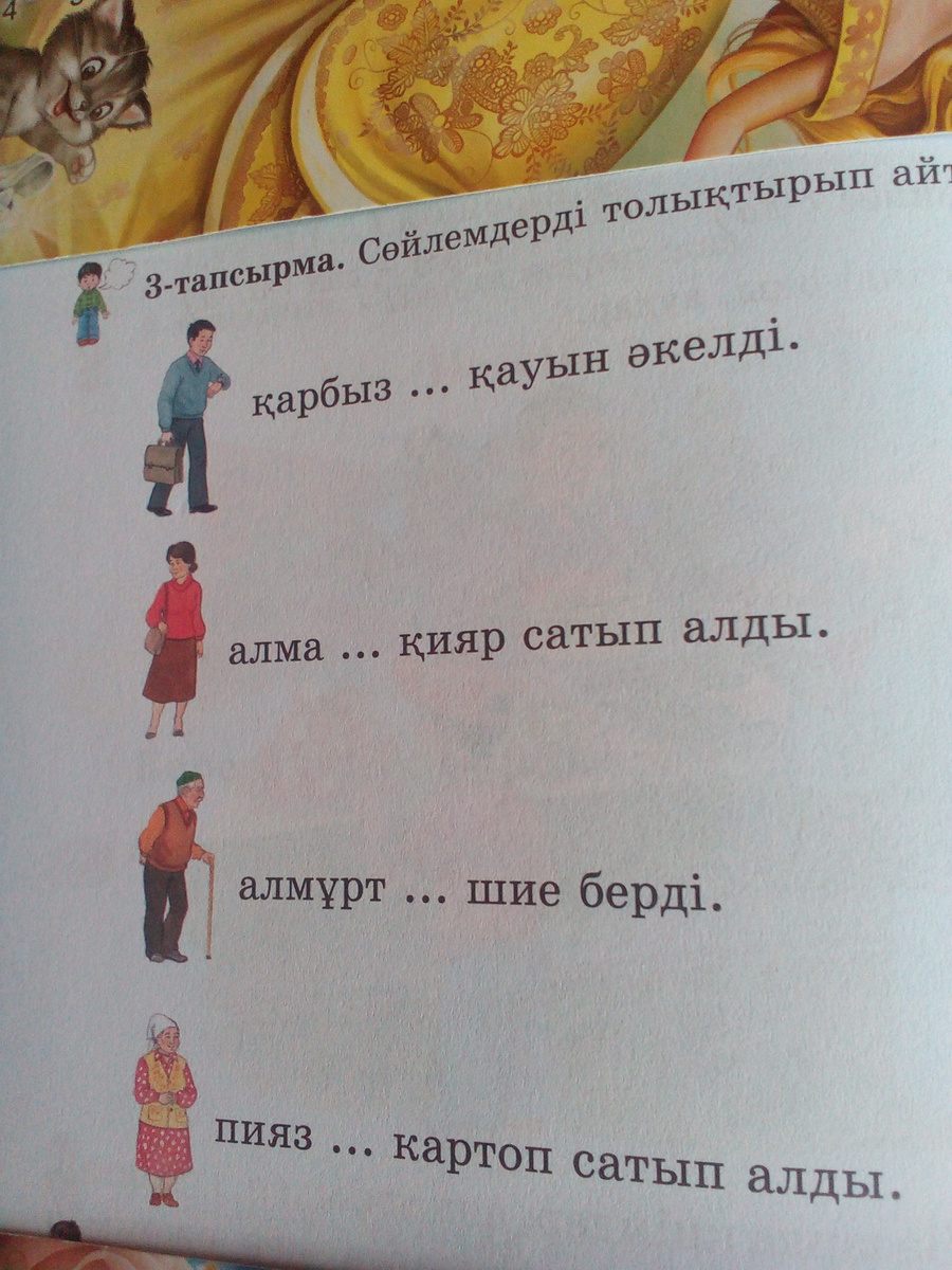 Акем карбыз бен кауын акелди.Анам алма мен кияр сатып алды.