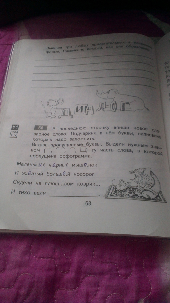 Сидели на плюшЕВом (суффикс) коврикЕ , Е - окончание