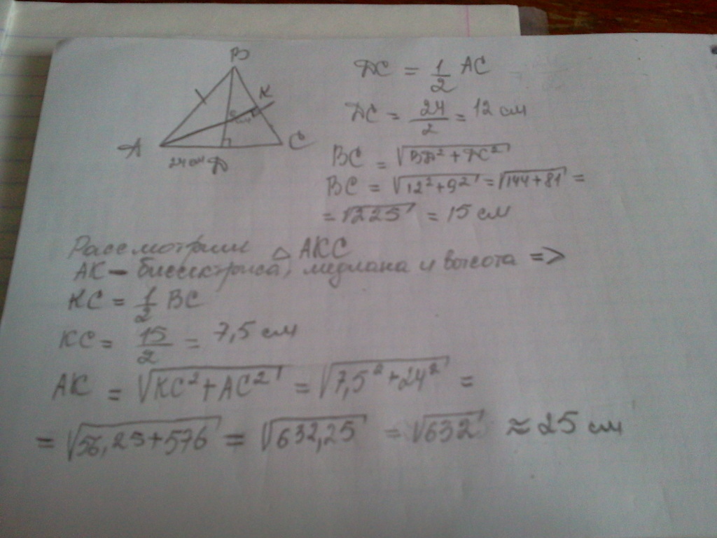 в равнобедренном треугольнике с основанием 24 см, высота проведенная к основании равна 9, найти медиану проведенную от угла основания к боковой стороне