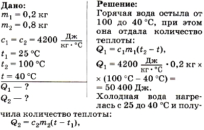 Смешали воду массой 0.8кг, имеющею температуру 25 ℃, и воду при температуре 100 ℃ массой 0.2 кг. Температуру полученной смеси измерили, и она оказалась равной 40 ℃. Вычислите, какое количество тепло отдала горячая вода при охлаждении, какое количество теплоты получила холодная вода при нагревании ,сравните их.