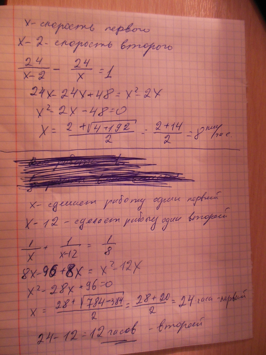 2)Двое рабочих выполняли некоторую работу за 8 часов.Первый из них,работая отдельно, может выполнить ту же работу на 12ч быстрее второго, если тот будет работать отдельно.За сколько часов второй рабочий один может выполнить ту же работу?
