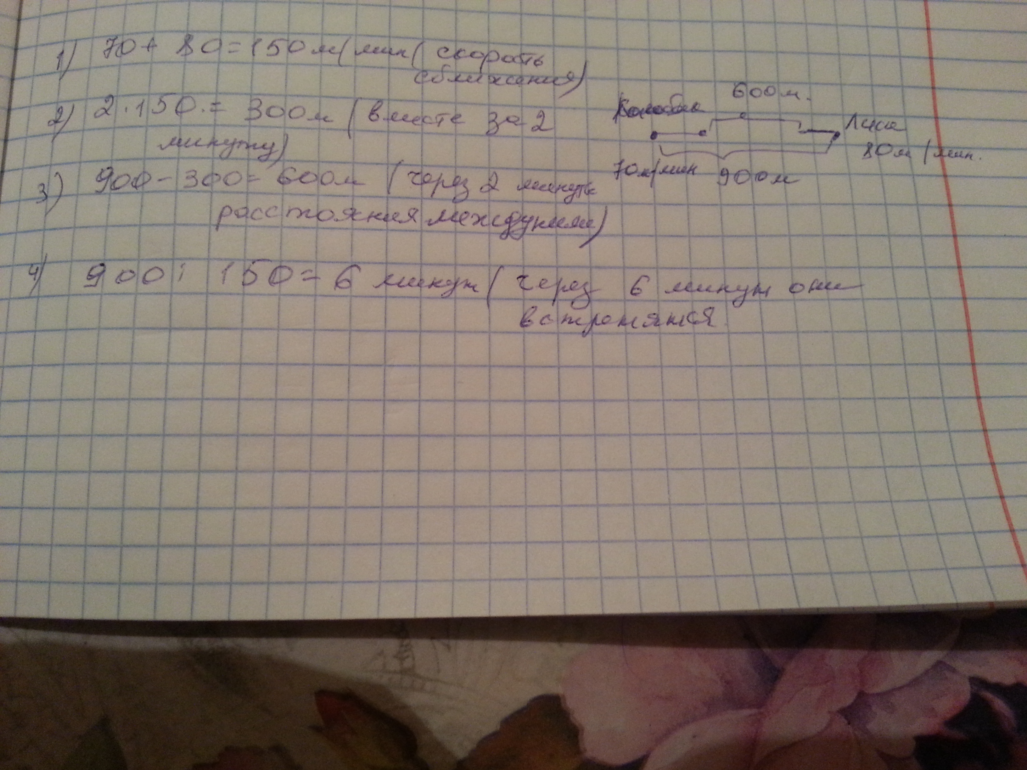 колобок катится навстречу лисе сейчас между ними 900м скорость колобка70 метров в минуту а скорость лисы80 метров в минуту какое расстояние будет между ними через 2 минуты через сколько минут