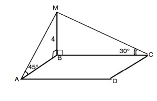 ABCD прямоугольник MB перпендикулярна ABCD, MB=4СМ,угол MAB=45 градусов,угол MBC=30 градусов,найти AB и BC