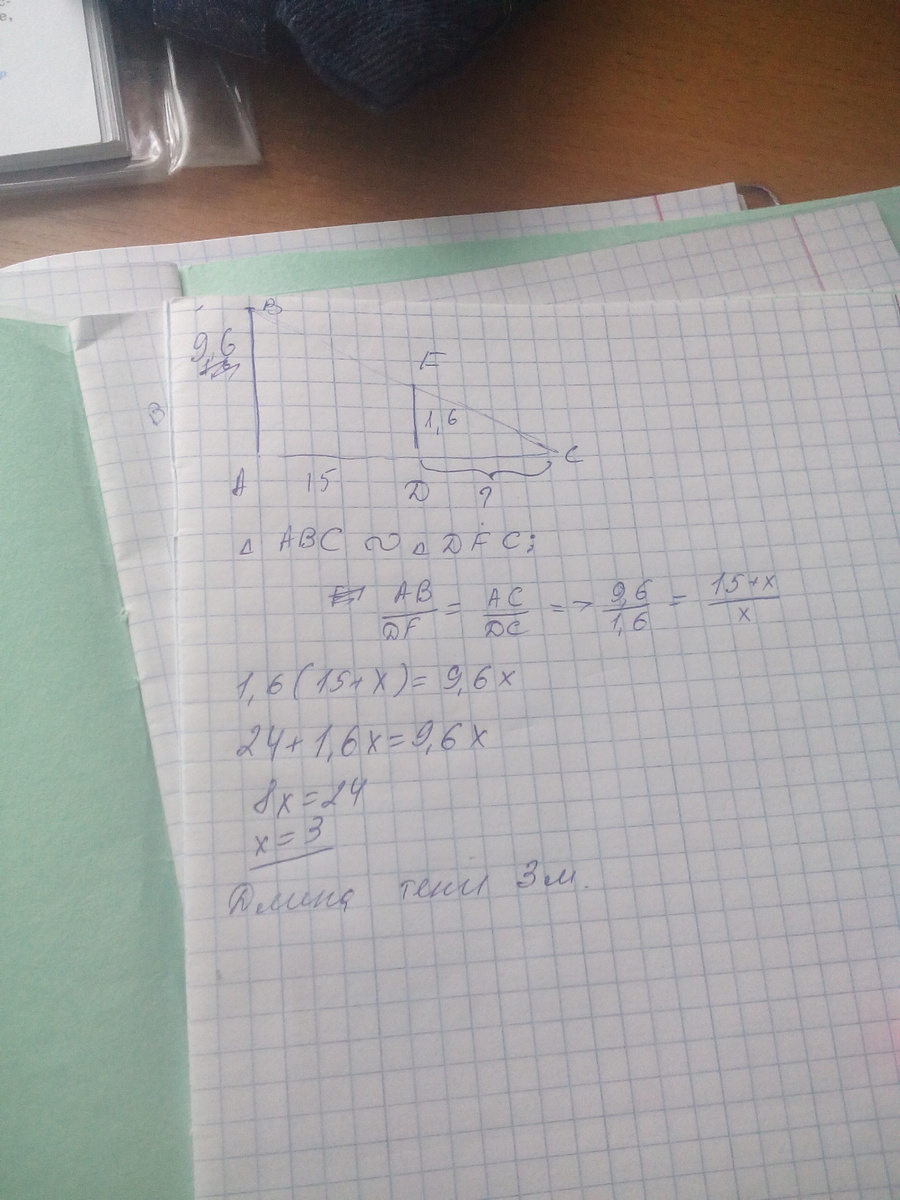 Человек ростом 1,6м стоит на расстоянии 15м от столба, на котором висит фонарь на высоте 9,6м. Найдите длину тени человека в метрах.