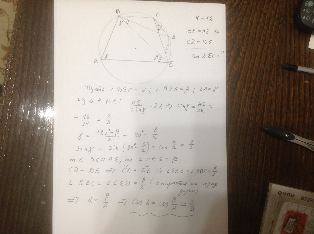 ABCDE — пятиугольник, вписанный в окружность радиуса 12. Прямые AE и ВC параллельны, CD = DE, BE = AE =16. Найдите косинус угла DEC.