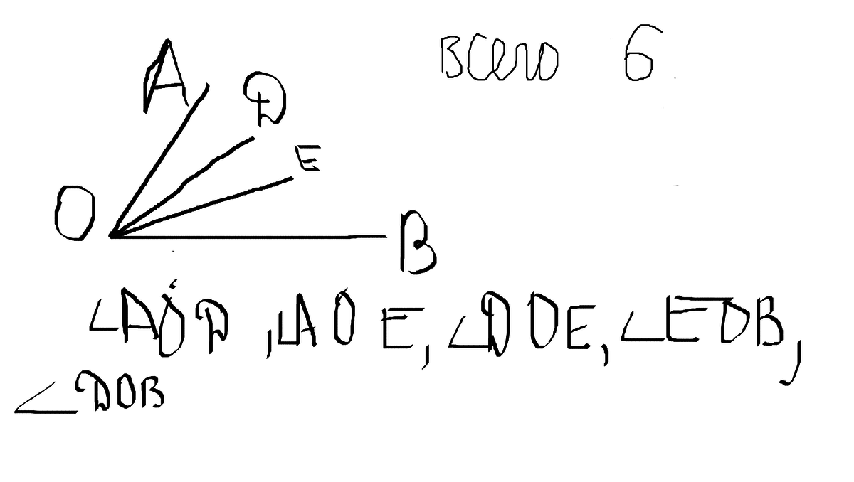 По стройте острый угол AOB. Проведите внутри этого угла два луча OD и OE. Сколько острых углов получилось ?