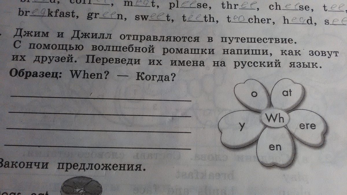 Джим и Джилл отправляются в путешествие.с помощью волшебной ромашки напиши как зовут их друзей.переведи их имена на русский язык