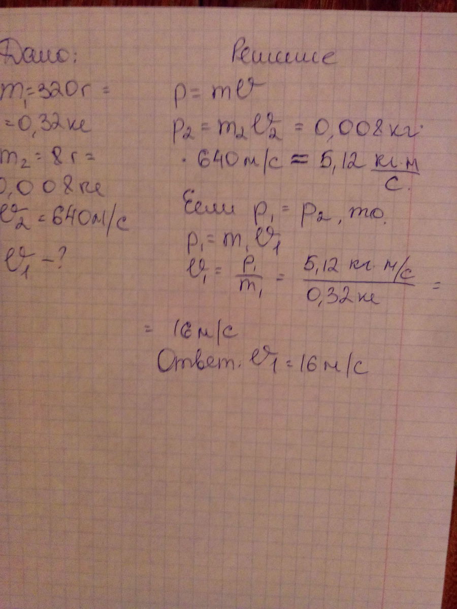 С какой скоростью должен лететь футбольный мяч массой 320 г чтобы его импульс был равен импульсу пули массой 8 грамм летящий со скоростью 640 метров на секунду