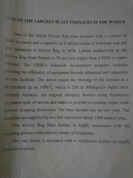 Один из крупнейших Кривой Рог доменных печей объемом 5000 куб. м и мощностью 4 млн тонн чугуна в год был введен в эксплуатацию в Кривой Рог в 1974 году. Производительность труда на криворожской доменной печи на 30 процентов выше, то 3200 кр метровой печи. В СССР промышленное развитие программы включает в себя повышение эффективности работы оборудования, хотя усиленной мощности новых объектов. Печки обеспечения продувки печи при температуре до 1450 с, которая составляет от 200 до 300 градусов выше, чем обычные печи. Оригинальная зарядка устройств с помощью гидравлики увеличивает промежуток службы и позволяет проводить ремонтные работы без остановки производства. Доменная печь имеет один двор. Материалы поставляются с двух ленточных конвейеров около 1500 метров в длину. Криворожской доменной печи с высокой степенью автоматизации с выплавкой процесс контролируется с помощью компьютеров. Литой дом оснащен системой вентиляции для подачи свежего воздуха.