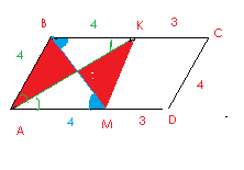 3) Обе биссектрисы разбивают параллелограмм на три равных прямоугольных треугольника. Соединяем точки К и М получаем ромб со стороной 4 и параллелограмм со стороной 3 и 4