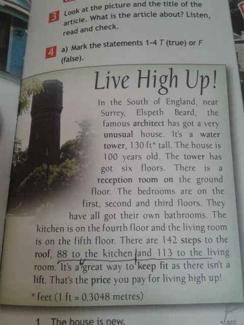 На юге Англии, около Сюррэя, Элспет Биарда, знаменитый архитектор построил очень необычный дом. Это водонапорная башня, 130 футов высотой. Этому Дому 100 лет. Башня имеет шесть этажей. Есть приемная на первом этаже, спальни на первом, втором и третьем этажах. Во всех спальнях есть своя ванная комната. Кухня на четвертом этаже, и гостиная находится на пятом этаже. Там 142 ступенек до крыши, до кухни 88 и до гостиной 113, Это хорошая идея, как поддерживать себя в форме, потому что там нет ни одного лифта. Это цена которую нужно платить,чтобы жить высоко.