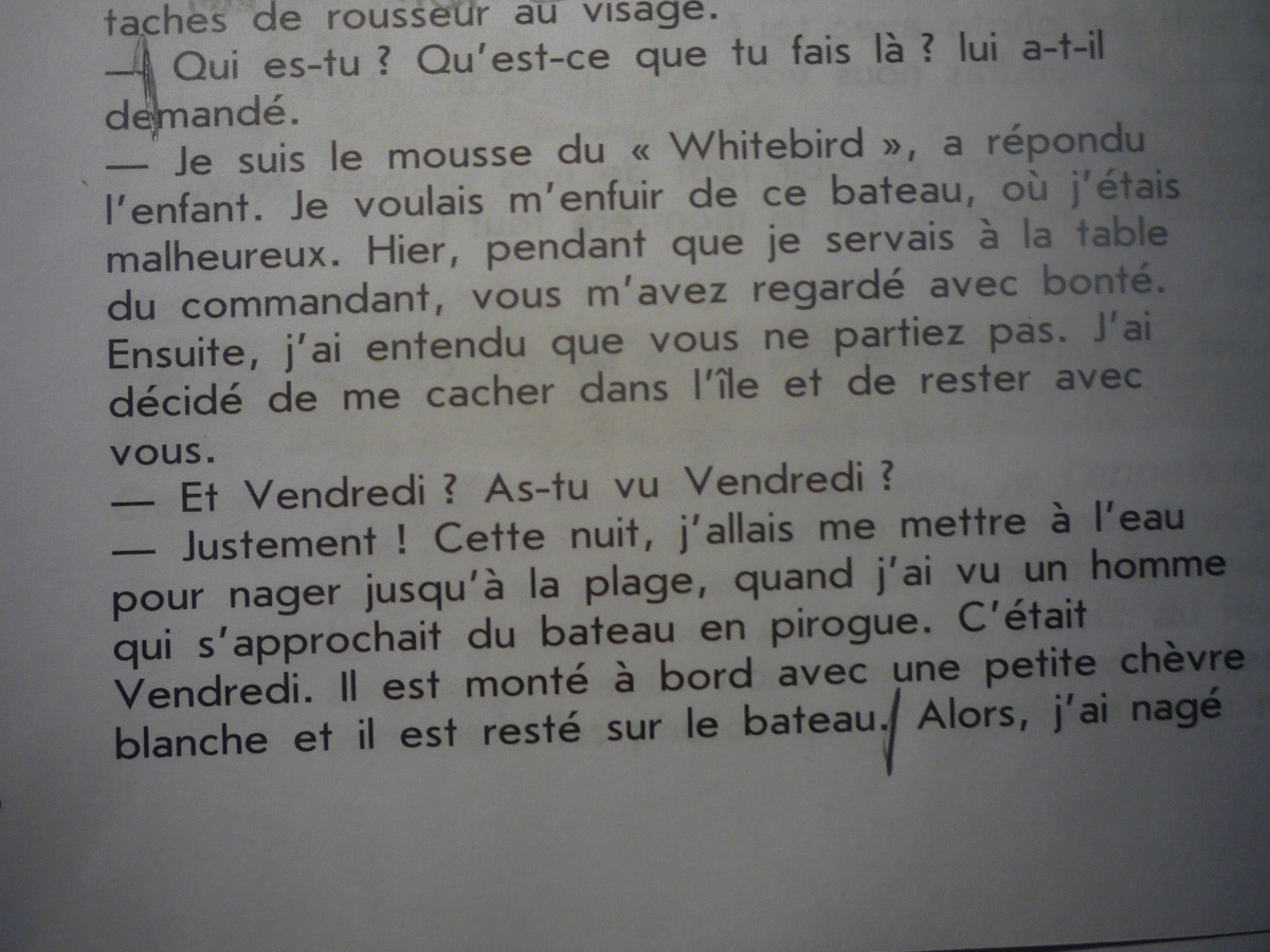 - Я юнга "Белой птицы (c англ.)", ответил ребёнок. Я хотел сбежать из той лодки, где я был несчастен. Вчера, в то время, как я служил в команде капитана, ты смотрел на меня с добротой. Потом я услышал, как ты сказал, что ты не желаешь покидать её. И я решил укрыться на острове вместе с тобой.