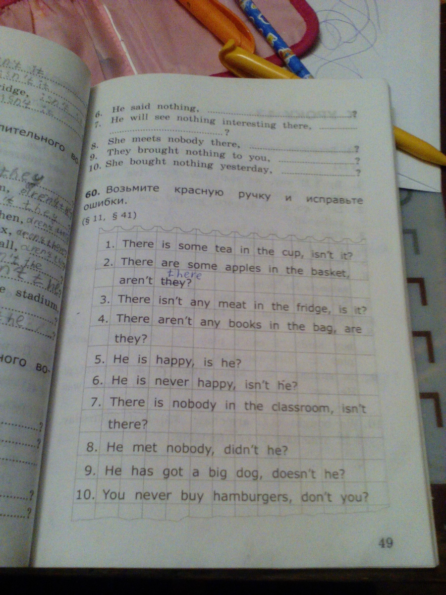 6. He said nothing, did he? 7.She will see nothing interesting there, did she? 8. She meets nobody there, does she? 9. They brought nothing to you, did they? 10. She bought nothing yesterday, did she? В 60-м задании: 1. В "хвостике" isn't there 3.В "хвостике" is there 4. В "хвостике" are there 5.В "хвостике" isn't he 6. В "хвостике" is he 7. В "хвостике" is there 8. В "хвостике" did he 9. В "хвостике" has he 10. В "хвостике" do you.
