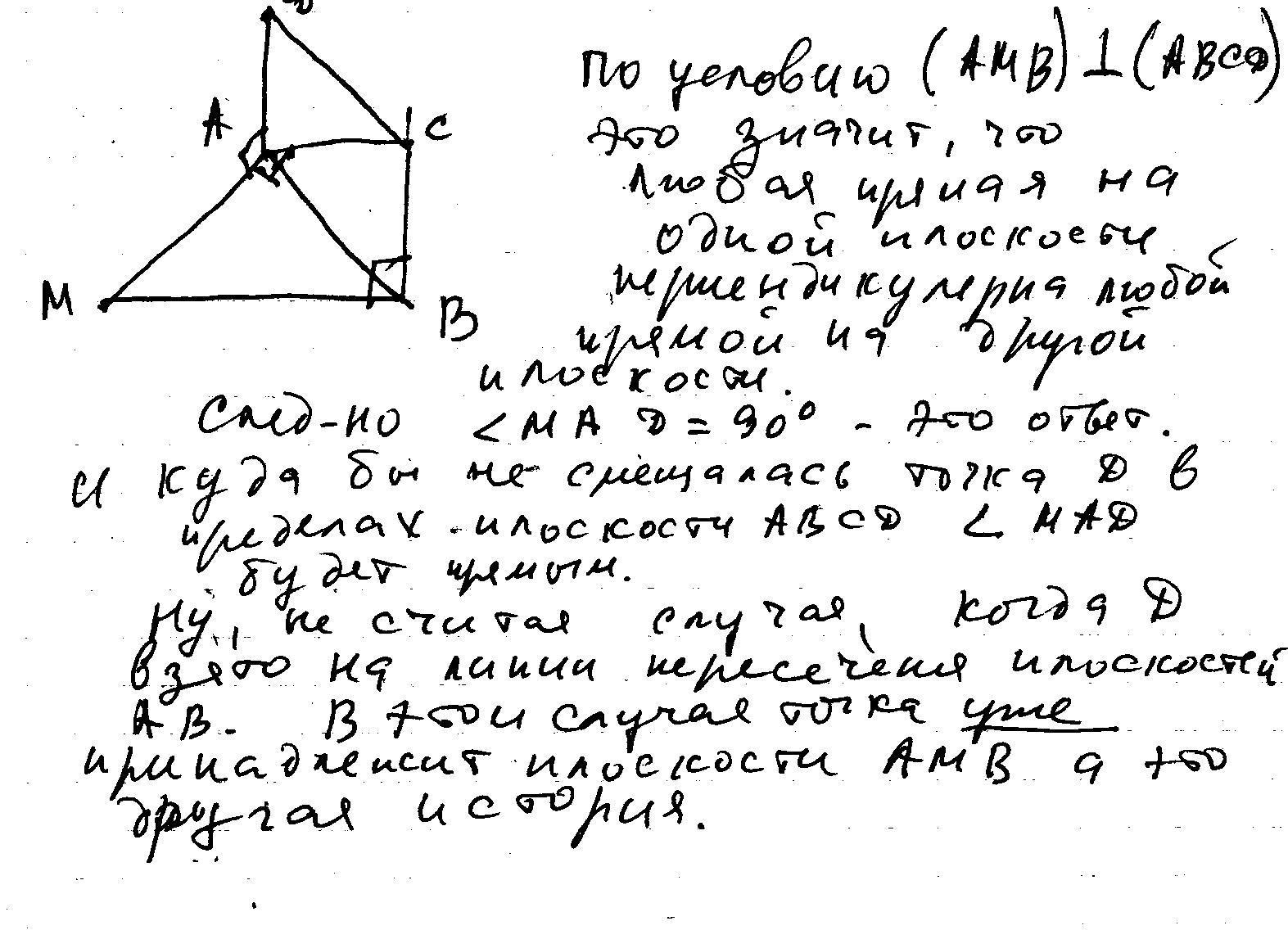 Треугольник AMB и прямоугольник АВСD расположены так, что их плоскости взаимно перпендикулярны. Найдите угол MAD/
