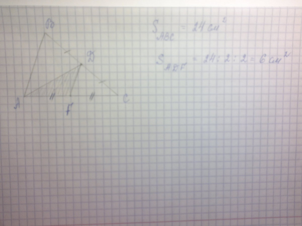 2)В треугольнике АВС проведена медиана АD, а в треугольнике ADC - медиана DF. Найдите площадь треугольника ADF, ечли плошадь треугольника АВС равна 24 см^2