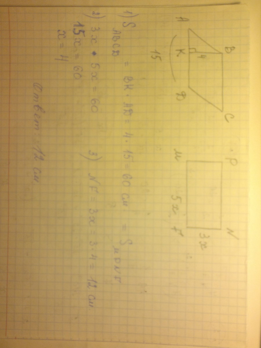 1)В параллелограмме сторона равна 15 см, а проведенная к ней высота 4 см. В прямоугольнике, равновеликому этому параллелограмму стороны относятся как 3:5. Найдите меньшую сторону прмоугольника.