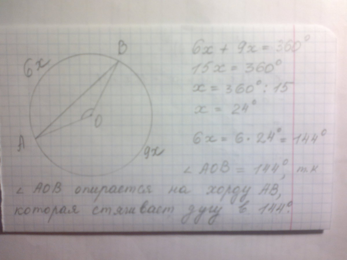 Хорда AB делит дугу окружности с центром О на две части,отношение которых равно 6:9.Найдите величину центровального угла AOB,если дуга АВ имеет меньшую градусную меру.