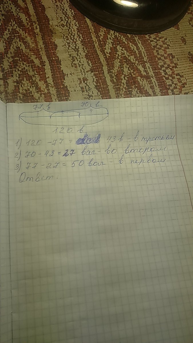 120-77=43в 3 тьем.120-70=50в 1вом.43+50=93в 1и 3тьем.120-93=27во 2ром.