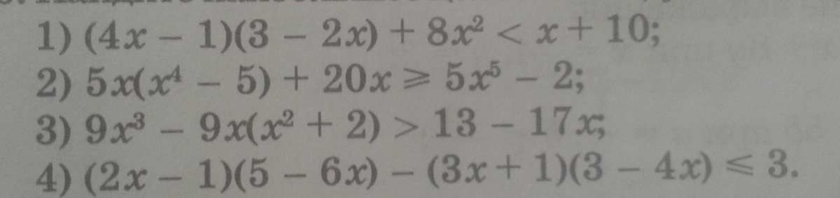 4); ; (2x-1)(5-6x)-(3x+1)(3-4x) leq 3\\10x-12x^2-5+6x-9x+12x^2-3+4x-3 leq 0\\11x-11 leq 0\\11x leq 11\\x leq 1