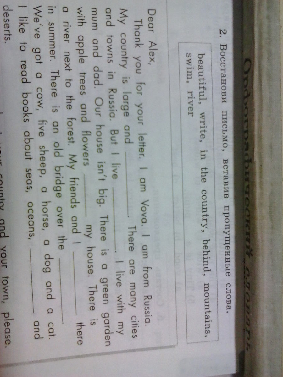 1 beautiful 2 in the country 3 behind 4 swim 5 river6 mountains7 write