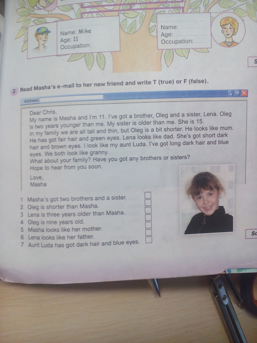 Меня зовут Маша и мне 11. У меня есть брат, Олег и сестра, Лена. Олег на 2 года младше меня. Моя сестра старше меня. Ей 15.