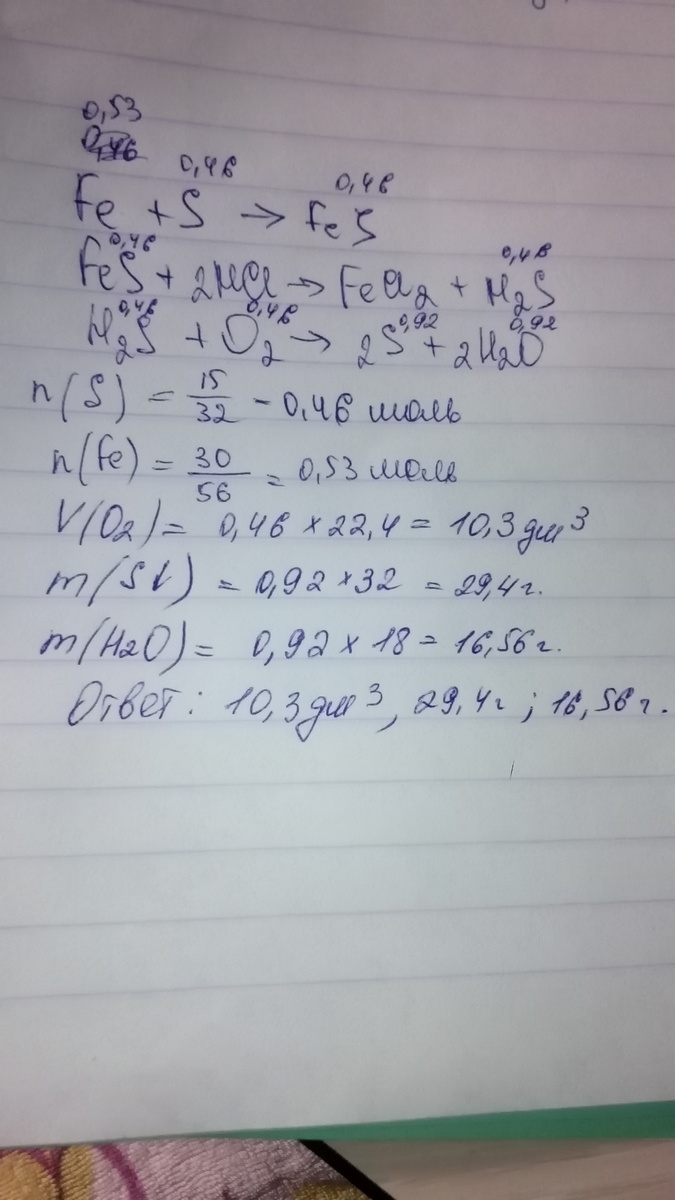 серу массой 15г сплавили с железом массой 30г. полученный продукт обработали избытком соляной кислоты. образовавшийся газ сожгли в кислорде получив после охлаждения паров до 20 градусов жидкое и твёрдое вещество. рассчитайте объём прореагировавшего кислорода и массы веществ, полученных в результате реакций горения
