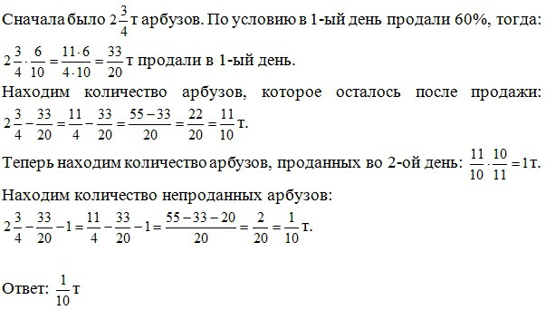 В магазин привезли две целых три четвертых тонны арбузов. В первый день было продано 60% всех арбузов . На след.день было продано 10/11 остатка . Сколько кг арбузов остались непроданными ?