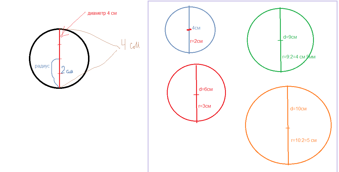 начертите окружность с данного диаметра. Проведите радиус и запишите какова его длина