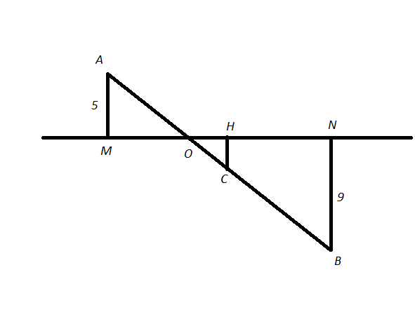 Точки а и б лежат по разные стороны от прямой l на расстояние 5 и 9 от нее ,найти расстояние от середины С отрезка аб до прямой l