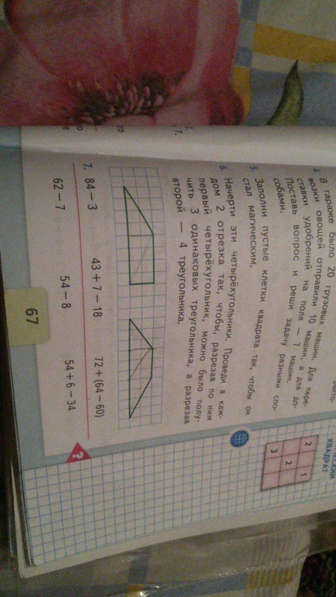 начерти эти четырёхугольники проведи в каждом 2отрезка так чтобы разрезав по ним первый четырёхугольник можно было получить 3 одиноковых триугольника а разрезав второй 4 треугольника